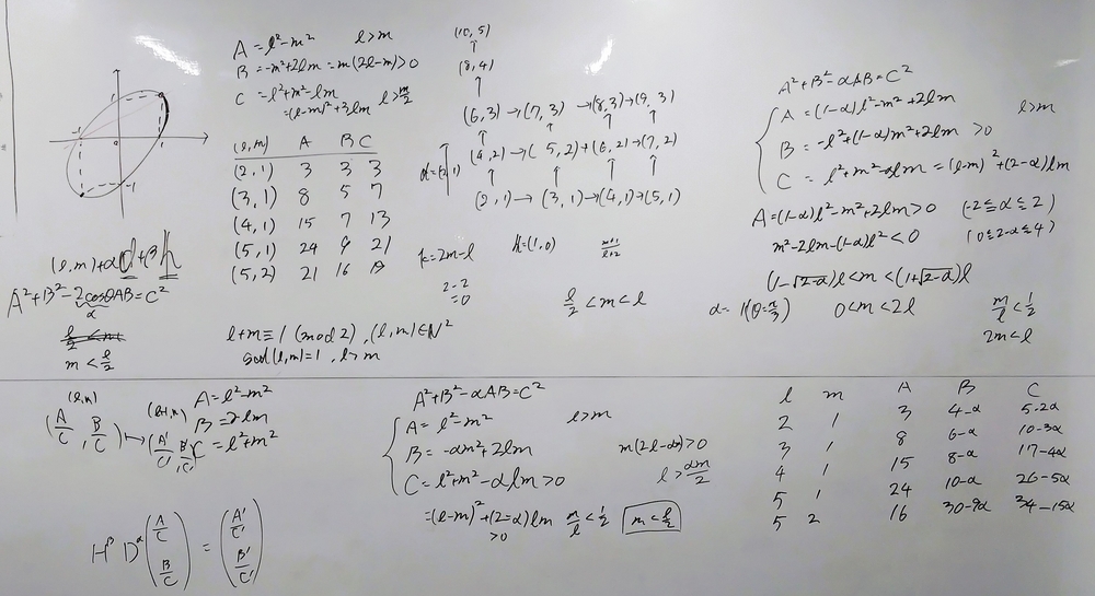 ピタゴラス数.対称な方がいいだろうぐらいの気持ちでを通る直線で楕円上の有理点を探したが,これだと余弦を一般にしたとき,必ずしも