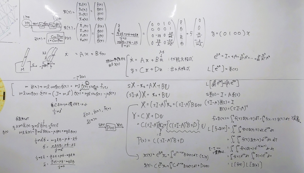簡単な台車モデルを素材に,微分方程式を解いて解を調べる方法と,ラプラス変換で代数的に処理する方法の2つを比較してきてもらった.とりあえず,この時点で安定性の話題まで出せたので,もう倒立振子へ進もう.