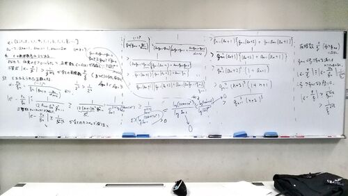 超越数.の無理数度が2であることの証明. の連分数展開が"比較的おとなしい"ことを利用したこの証明はもっと広い範囲の無理数の無理数度が2であると主張していた. 後半,解析的評価にしばし手こずったけど,何とか証明が完成した. ところでそのものの連…
