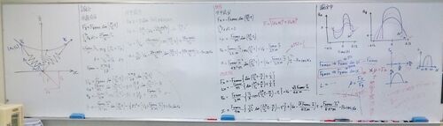 一人目,幅跳びの数理. 地面反力をで近似したモデルで,最大の力が入射角によるのではという疑問から入射角依存のモデルに変更しようとしている. 一方でこのモデルでは最大力となる時間は自動的に決まる. 人が調節できるのは入射角と接地点回りで体を起こ…