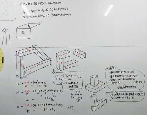 立体錯視.立体復元方程式の自由度の意味は納得したところで,問題の整理と提唱. 1.人間の直角志向による錯視図形の方程式による判定 不可能立体のが折れ曲がっていないように見える角を付け加えることでを達成し,実際に立体を作ること. 2.切断された…
